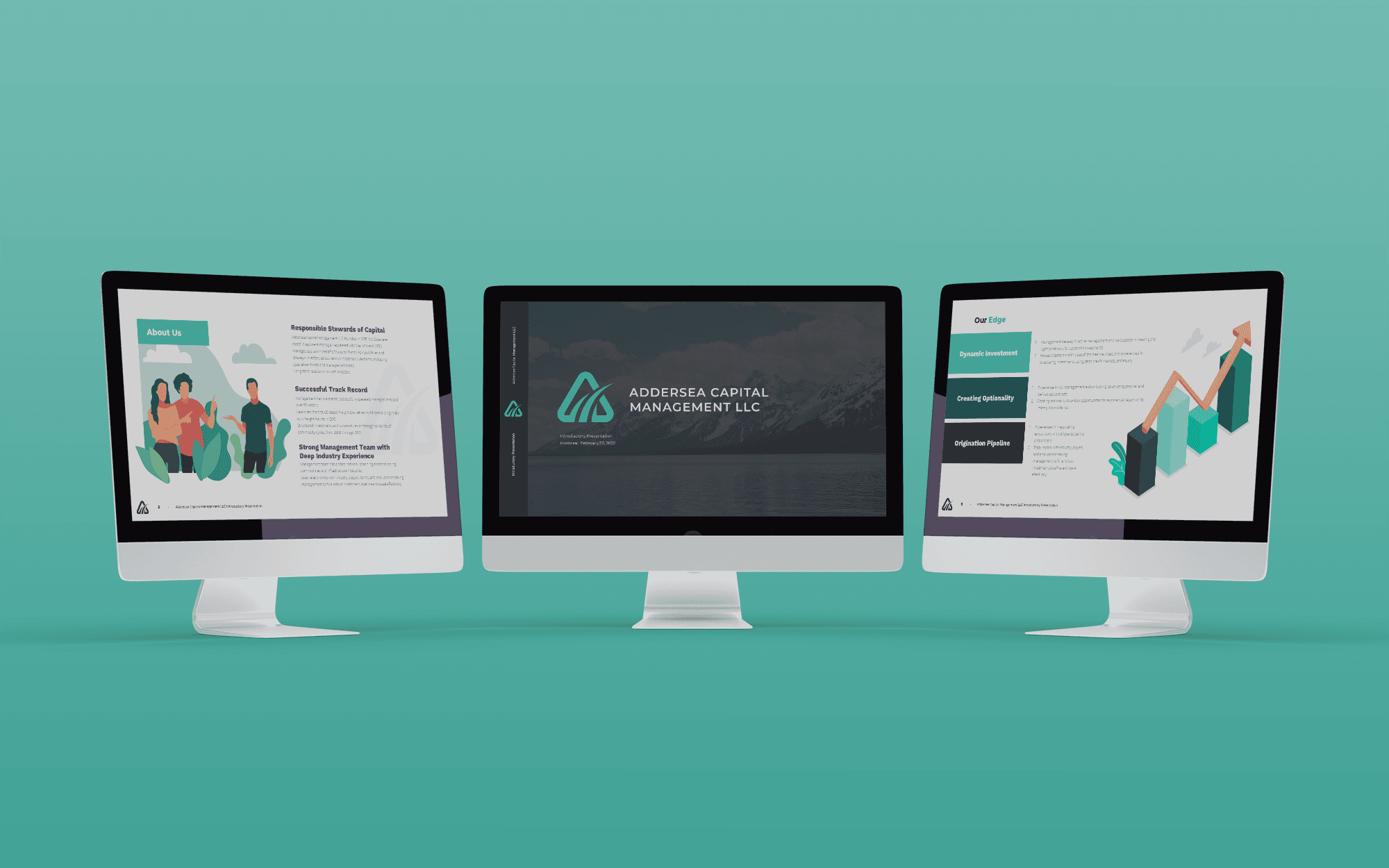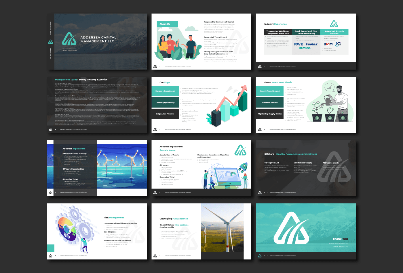 I developed a comprehensive presentation for Addersea Capital Management that highlights their impact fund, particularly focusing on green energy and offshore investment opportunities. The presentation features a modern green and teal color scheme, along with clean visuals and graphics that emphasize the company’s commitment to sustainability and responsible investing. Key slides cover the company’s approach to risk management, offshore investment prospects, and its track record, making it appealing to potential investors interested in environmentally friendly investment options.