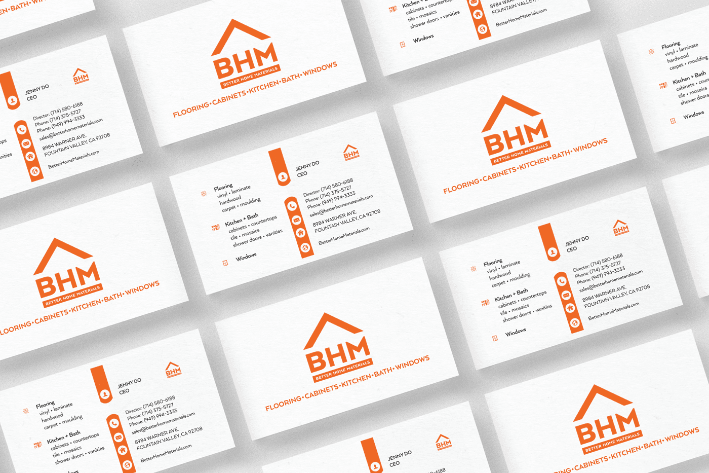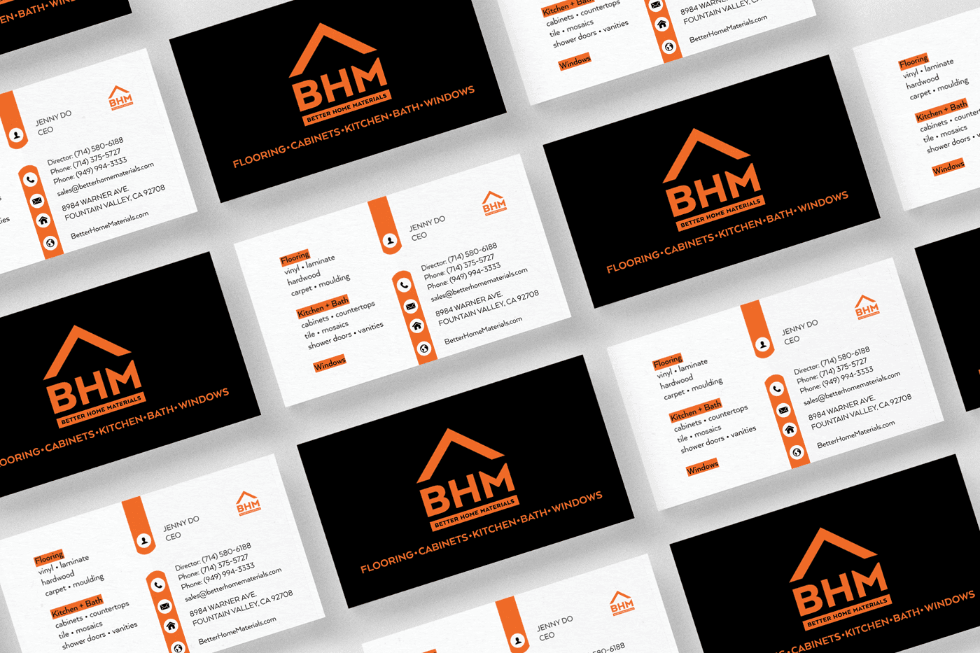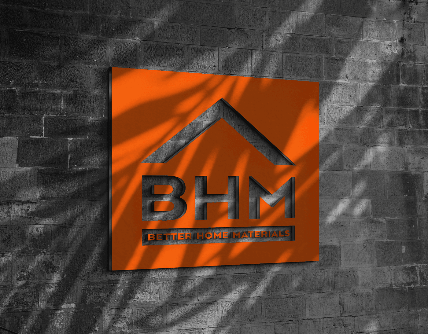 I have designed a cohesive brand identity and Logo for Better Home Materials (BHM). The design features a bold orange and black color scheme, highlighting BHM's focus on high-quality home improvement materials, with clear sections for flooring, cabinets, kitchens, baths, and windows. This branding approach enhances brand recognition and presents BHM as a trusted source of home materials.