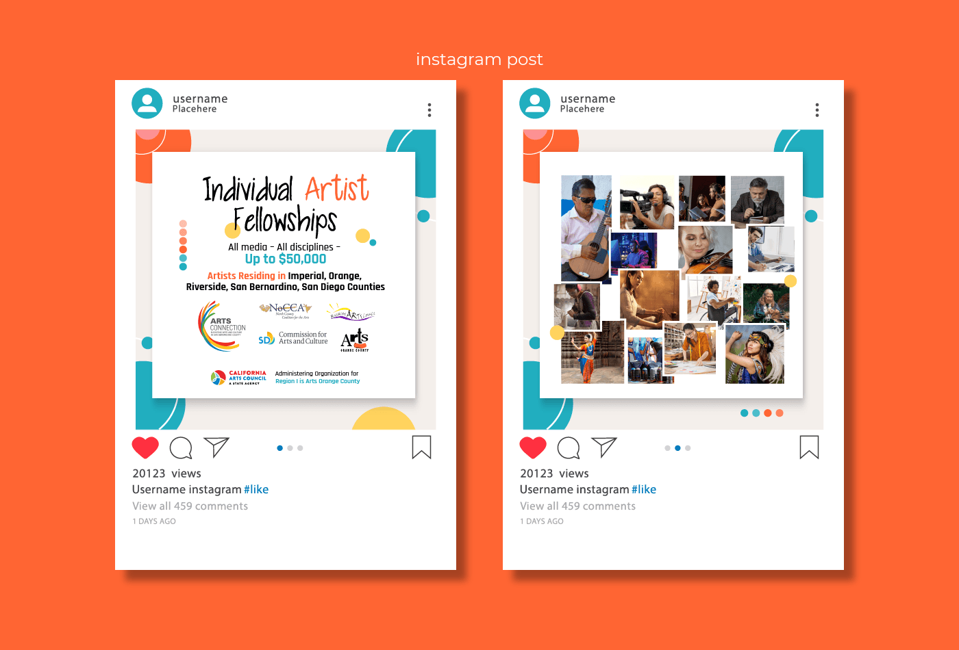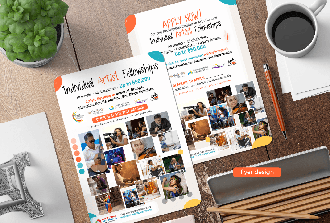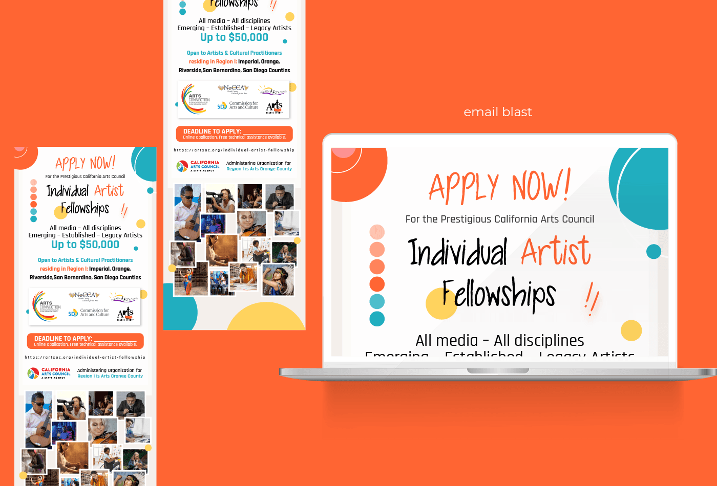 Created a cohesive digital and print campaign for the California Arts Council’s Individual Artist Fellowships. The project includes engaging designs for social media, email blasts, and print flyers, all featuring a vibrant color scheme and dynamic typography to capture attention and inspire artist applications. Each piece is tailored to its platform for maximum reach and impact.