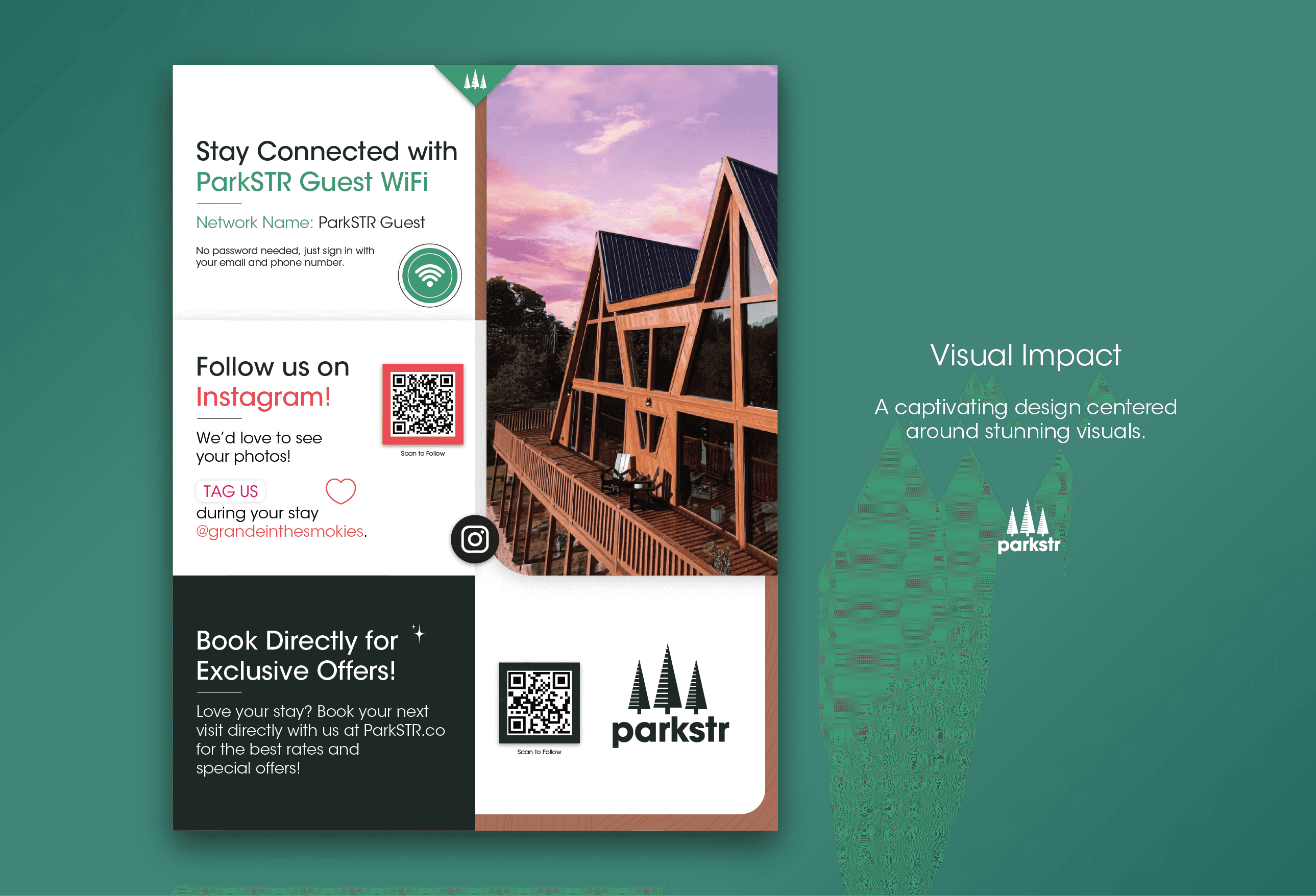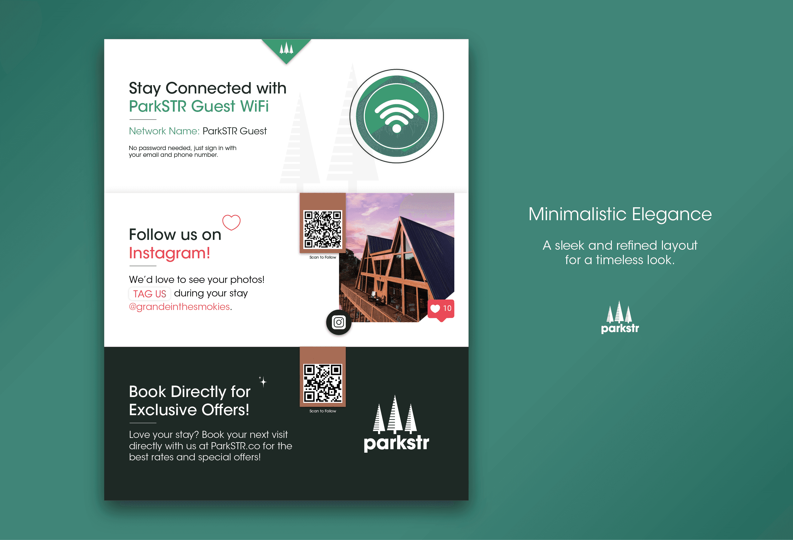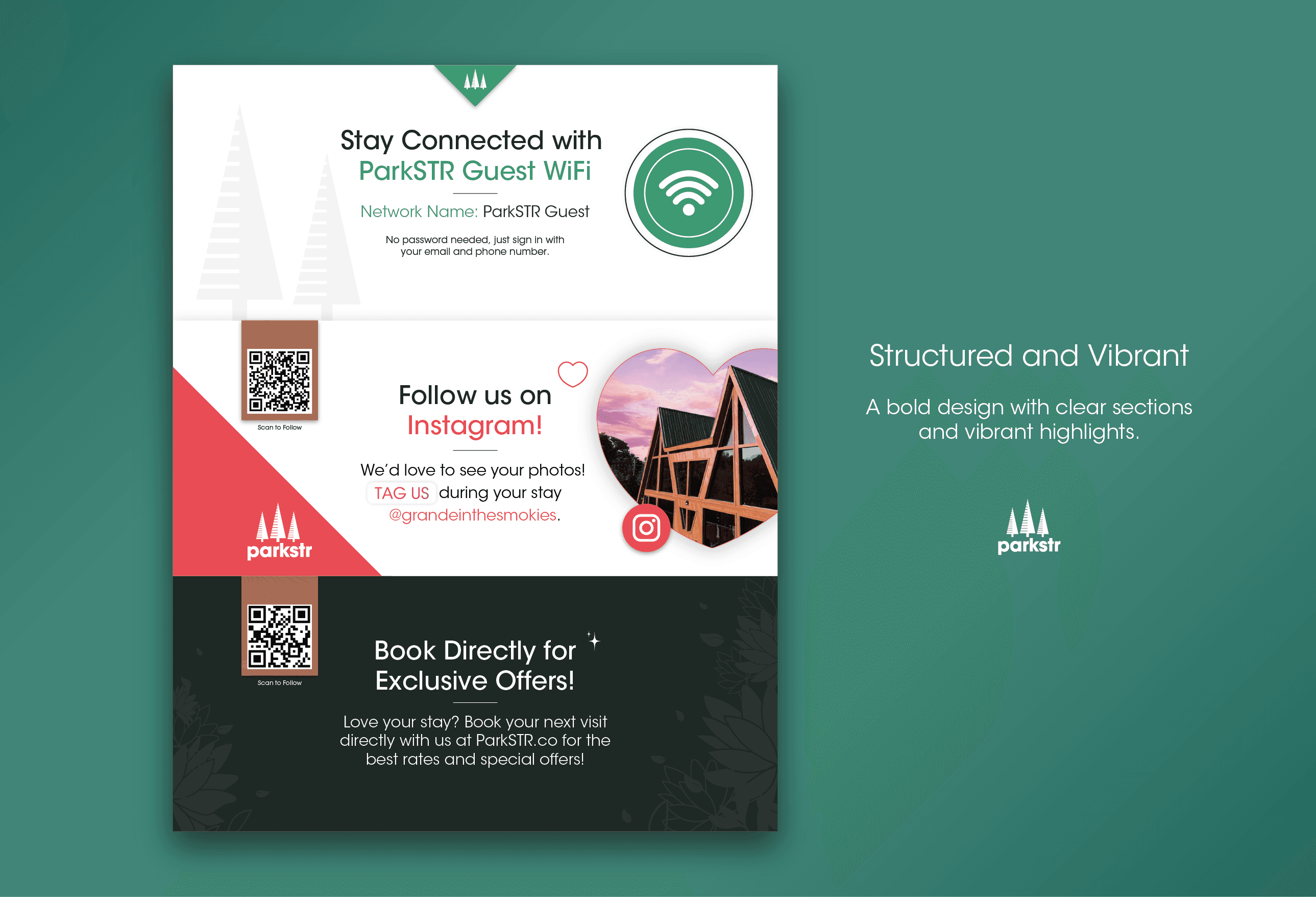 A visual communication system designed for ParkSTR’s guest spaces, focusing on connectivity, brand engagement, and direct booking incentives. This set explores three design directions, Structured & Vibrant, Visual Impact, and Minimalistic Elegance, each tailored to enhance guest experience while maintaining visual coherence with the brand’s modern, nature-inspired identity.