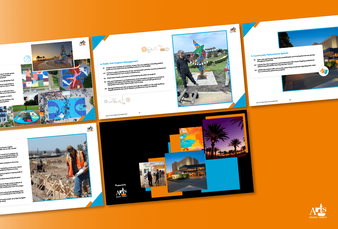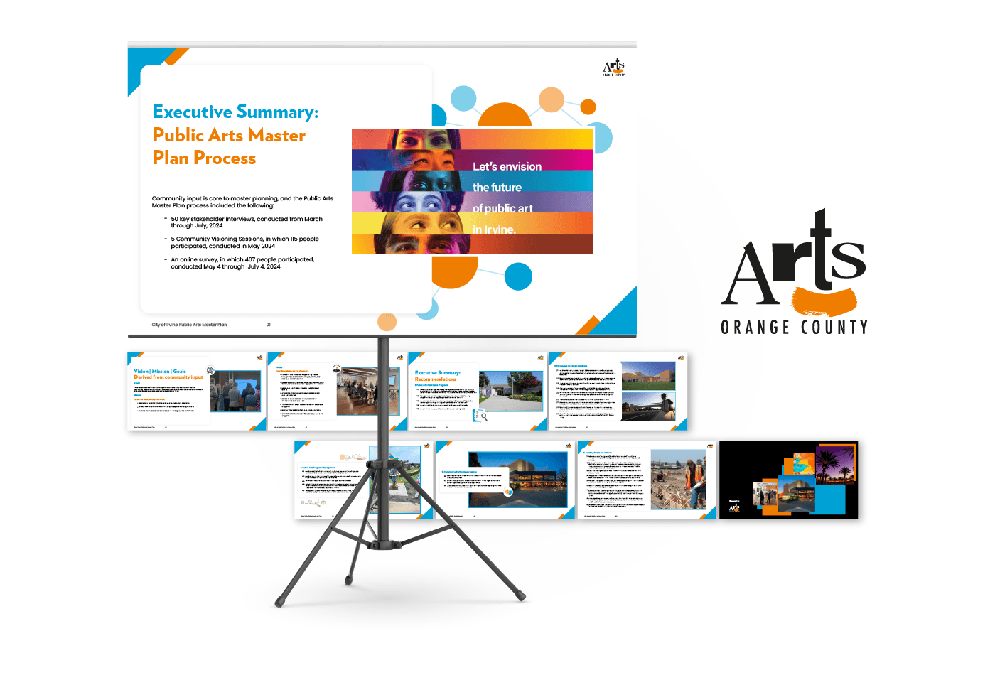 I have developed a visually appealing presentation for the City of Irvine's Public Arts Master Plan, commissioned by Arts Orange County. The design included consistent branding elements, dynamic layouts, and colorful graphics to effectively communicate the master plan's process, vision, and recommendations, ensuring audience engagement and clarity.