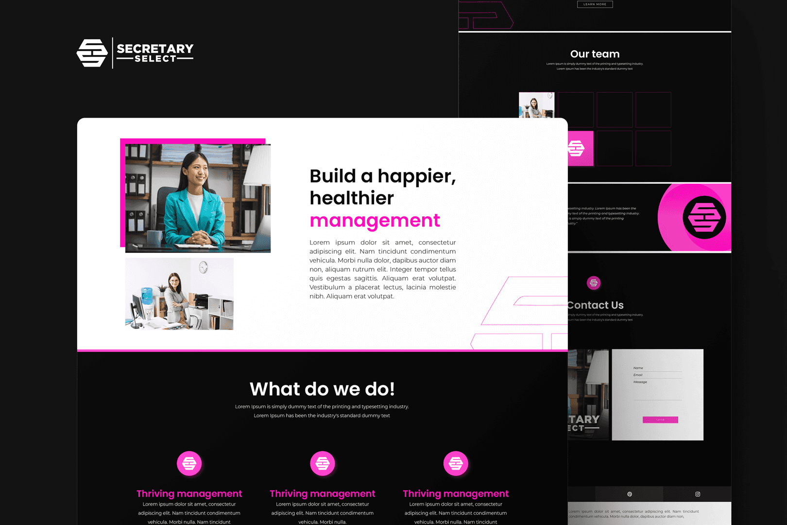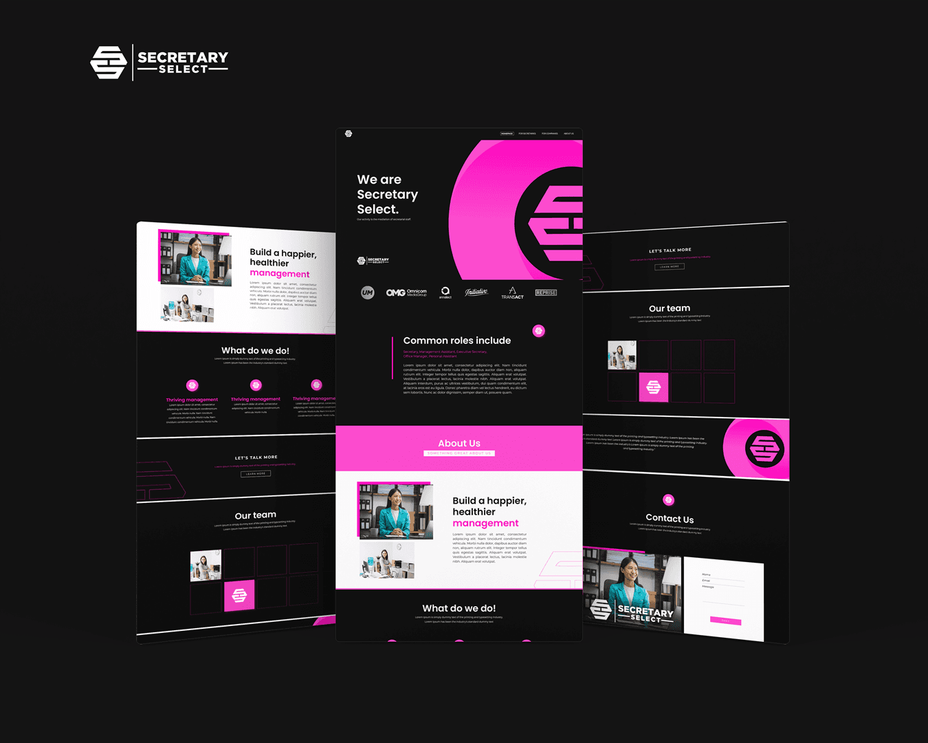This project involved the creation of a sleek, modern website for Secretary Select, a staffing and recruitment service specializing in executive and management-level roles. The objective was to design a bold, visually striking site that reflects the brand’s professional identity while staying minimal and user-focused. Key highlights of the design: • Bold color palette: A striking black-and-pink theme that establishes a memorable brand presence. • Responsive layout: Optimized for both desktop and mobile browsing, ensuring seamless accessibility. • Clear typography and hierarchy: Easy-to-navigate sections that highlight services, common roles, and partner logos. • Engagement-focused elements: Call-to-action buttons and smooth content flow to guide user interaction. This design emphasizes professionalism and modernity, aligning with the needs of businesses seeking top-tier executive talent.