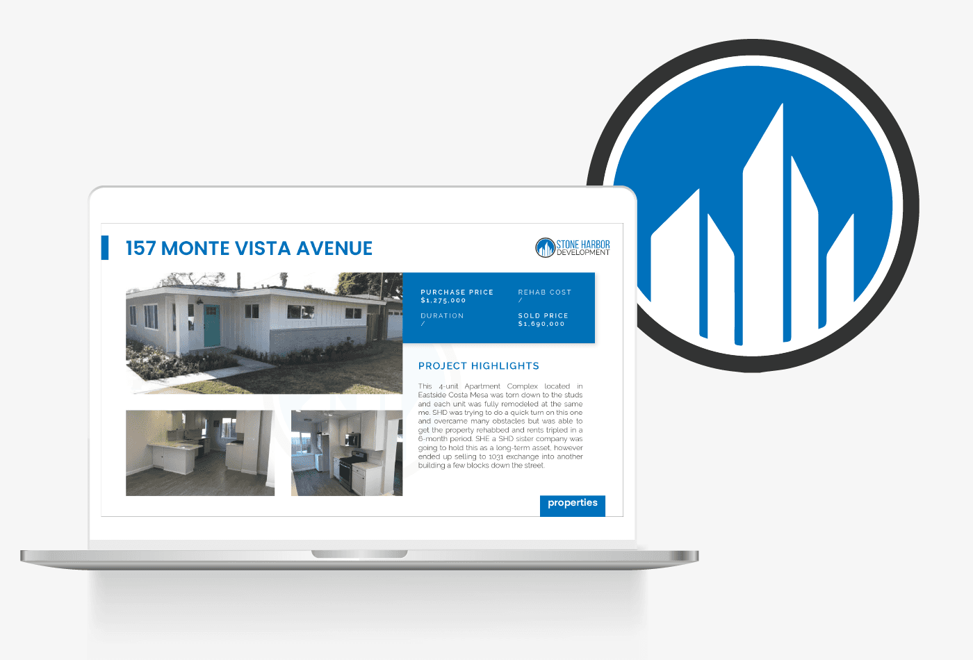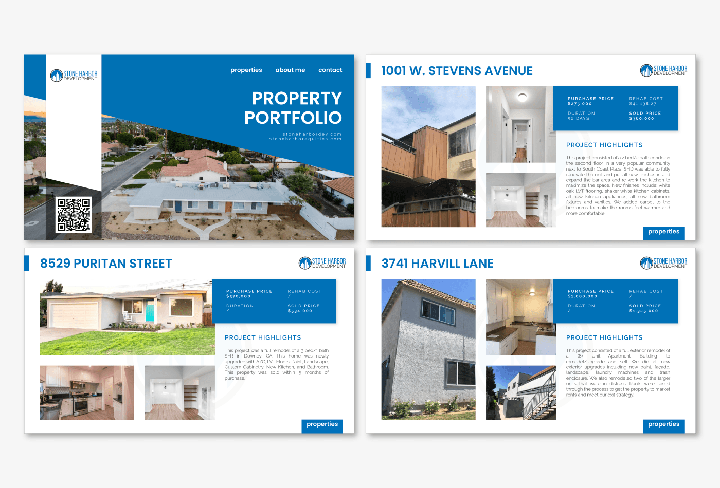I have developed a sleek, professional property portfolio layout for Stone Harbor Investments, showcasing a range of real estate assets with clean typography, modern icons, and consistent color branding. Each property page includes highlights, visuals, and key project data, offering an organized and visually appealing presentation.